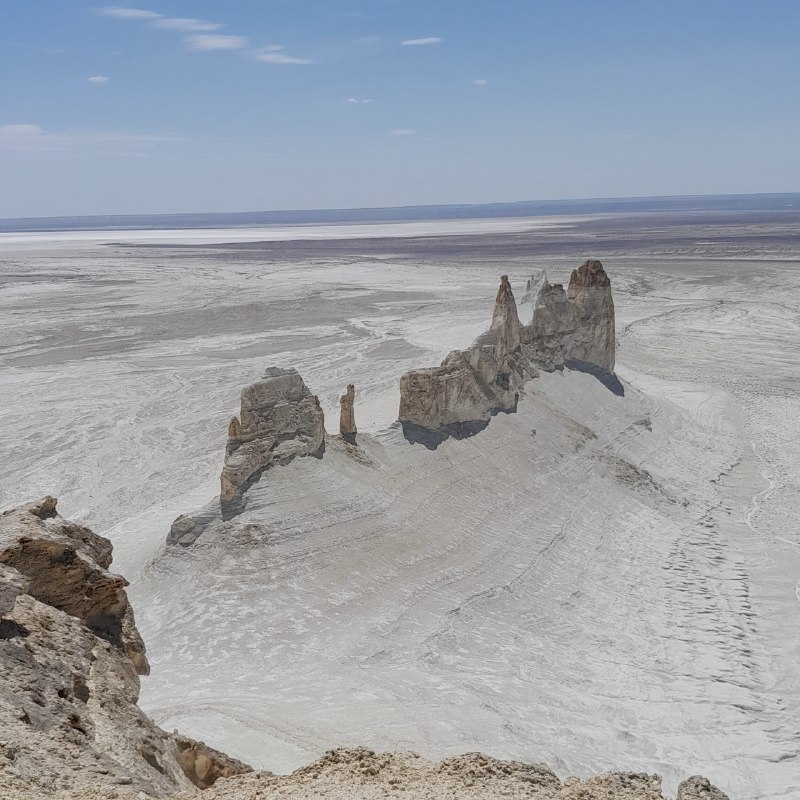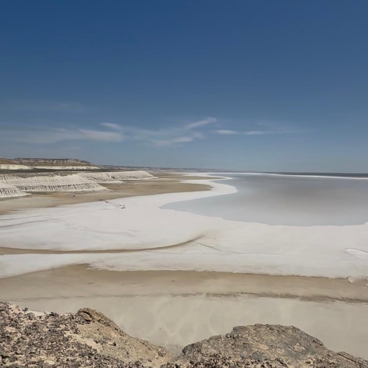 Discover the breathtaking Tuzbair Saline, where endless white salt flats meet dramatic limestone cliffs and unique desert landscapes. This surreal natural wonder is perfect for photography, hiking, and experiencing the untouched beauty of Central Asia.
